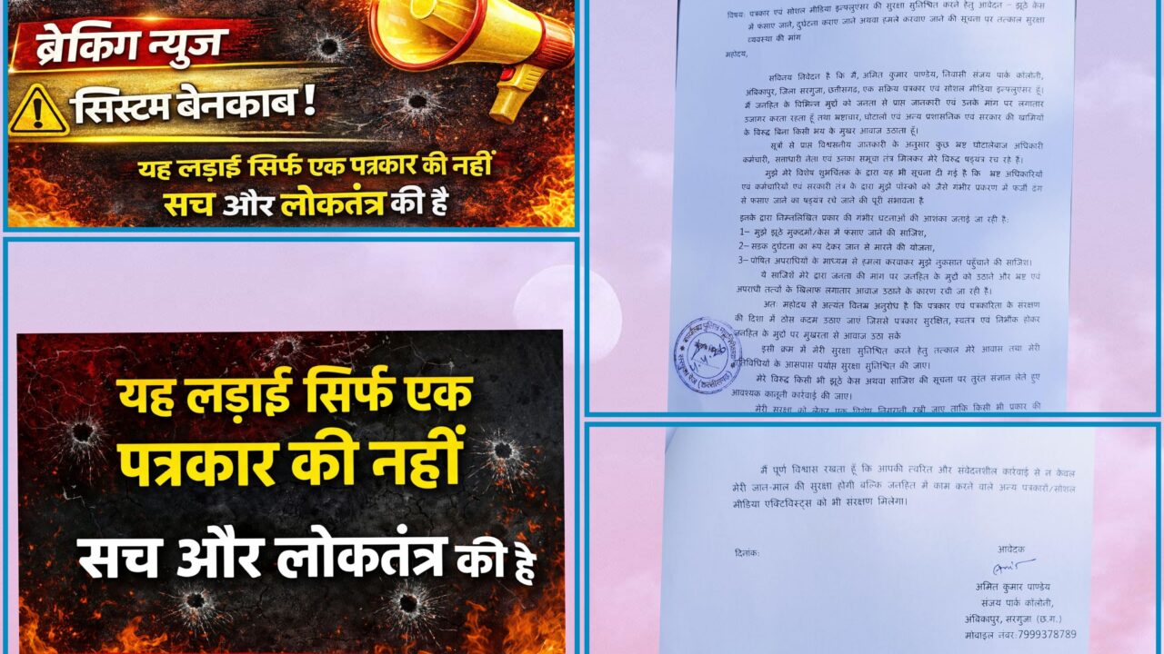 अंबिकापुर, सरगुजा /जिले के एक सक्रिय पत्रकार एवं सोशल मीडिया इंफ्लुएंसर अमित कुमार पाण्डेय ने अपनी जान को खतरा बताते...