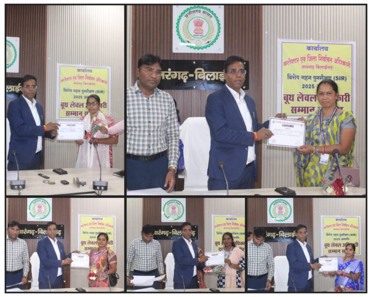 एसआईआर में अच्छा कार्य करने वाले 5 बीएलओ हुई सम्मानित सारंगढ़ बिलाईगढ़, 22 नवंबर 2025/कलेक्टर डॉ. संजय कन्नौजे ने सारंगढ़...