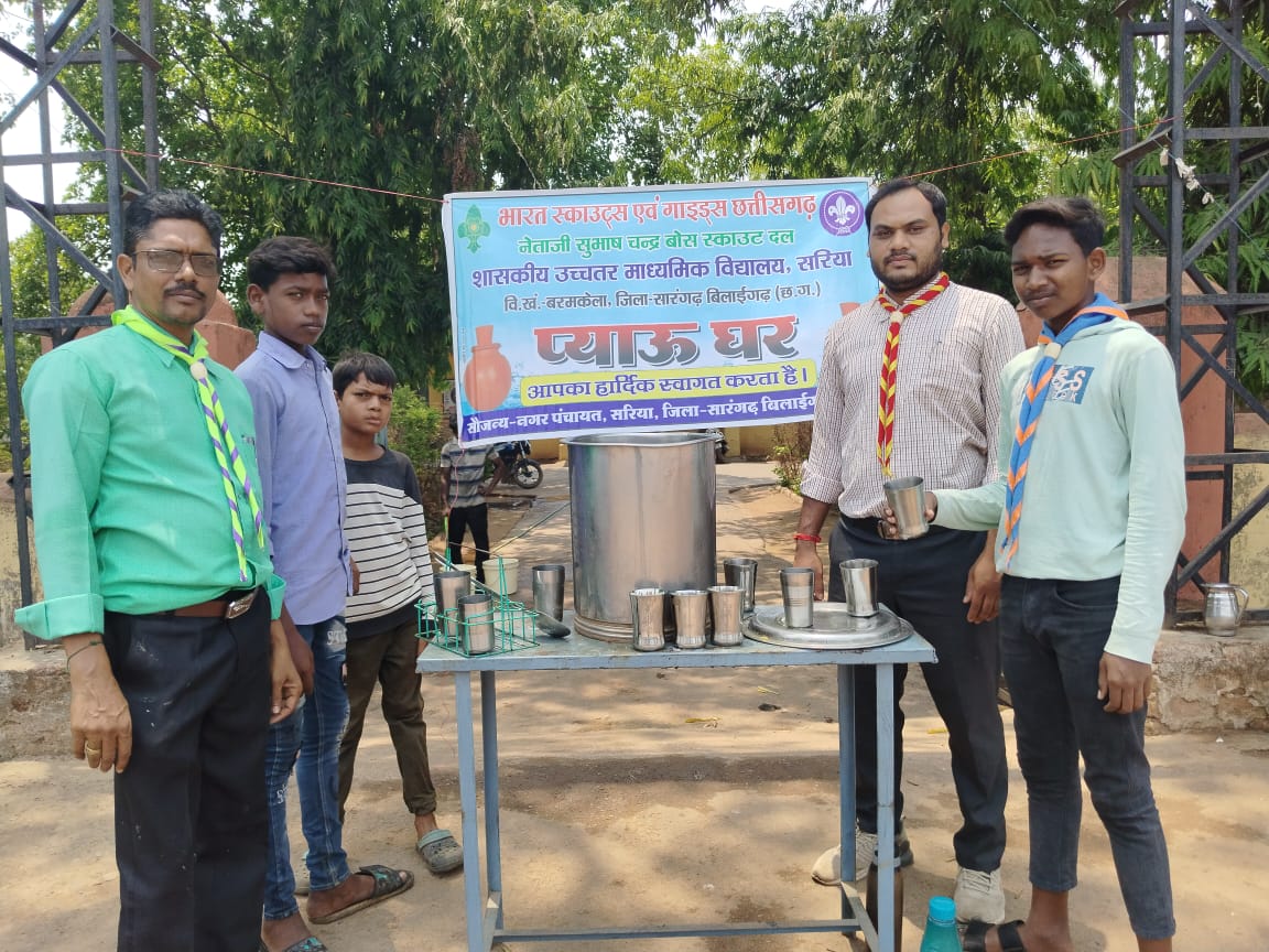 सरिया के स्काउट दल द्वारा मीठा बेल शरबत का वितरणभीषण गर्मी में लू से बचाने के लिए राहगीरों को मीठा निम्बू पानी पिलायाजब तक जल सुरक्षित है, तब तक कल सुरक्षित है।