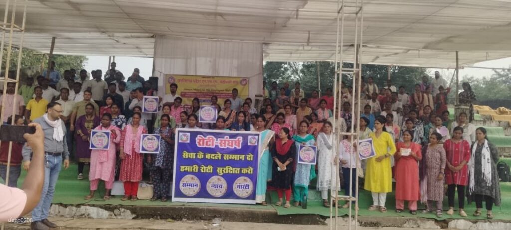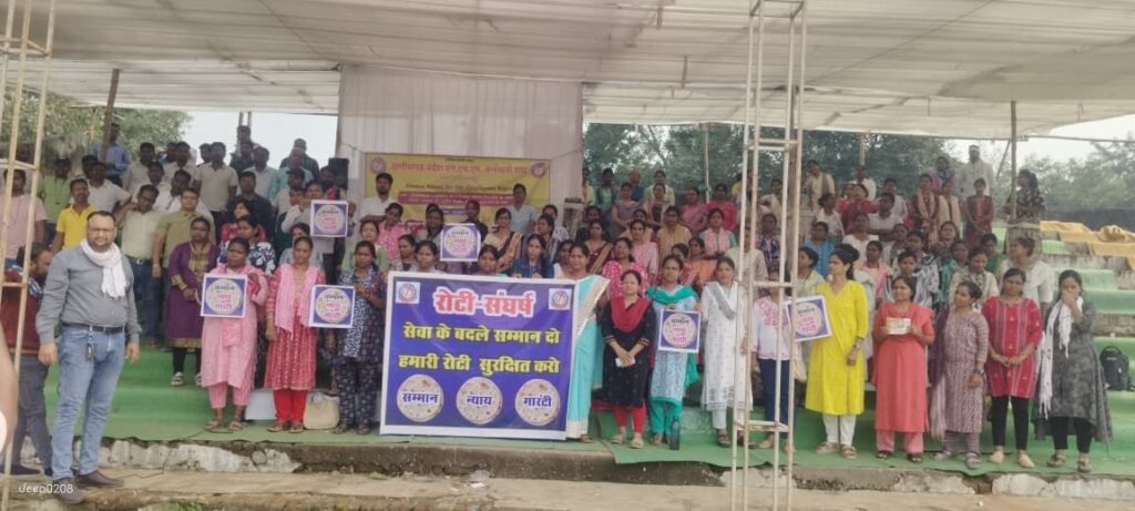 राष्ट्रीय स्वास्थ्य मिशन (NHM) के संविदा कर्मचारी अपनी दस सूत्रीय मांगों को लेकर अनिश्चितकालीन हड़ताल पर अडिग हैं। आज आंदोलन का 22वां दिन है, और कर्मचारियों का रोटी, सम्मान और न्याय का संघर्ष जोरों पर है। नारे गूंज रहे हैं: “एनएचएम कर्मचारियों का रोटी के लिए संघर्ष जारी! सेवा के बदले सम्मान दो! हमारी रोटी सुरक्षित करो! सम्मान, न्याय गारंटी दीजिए!”
