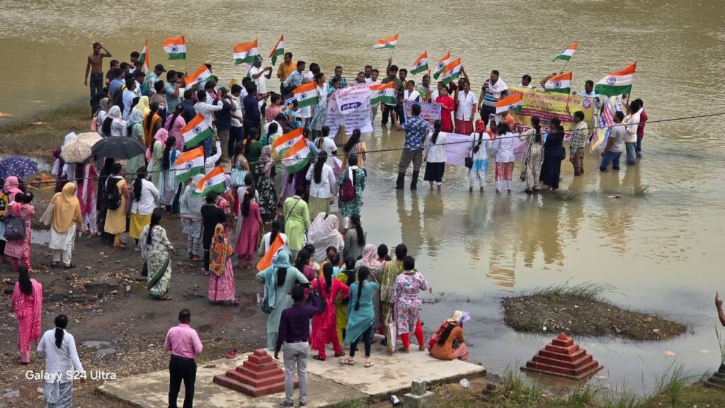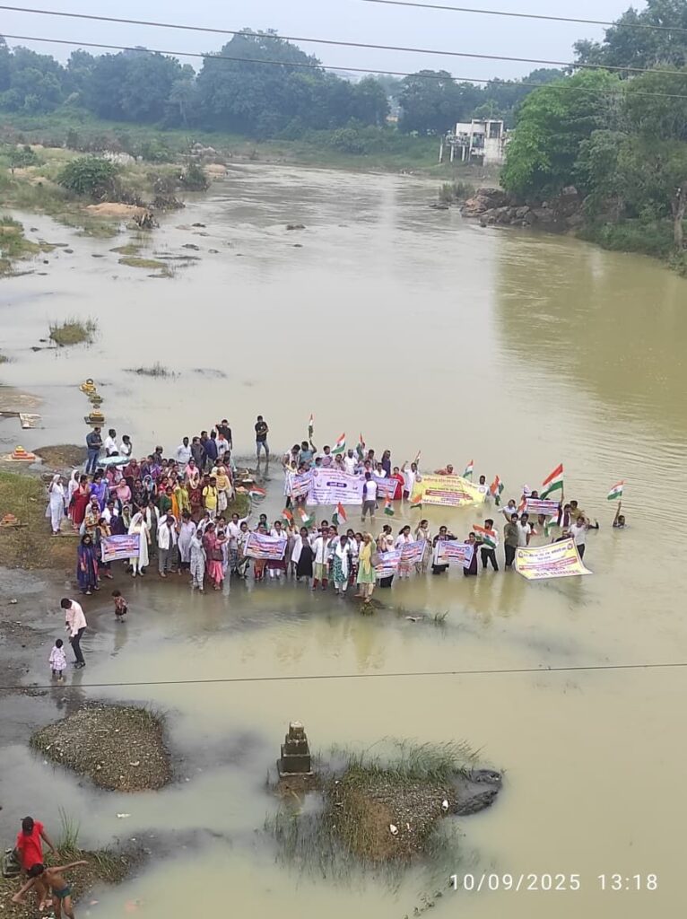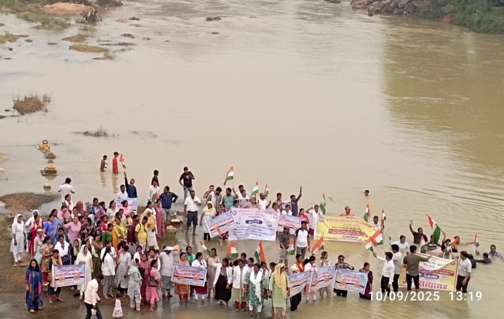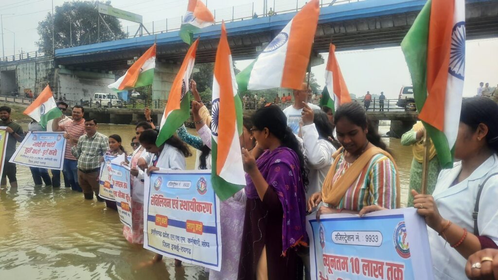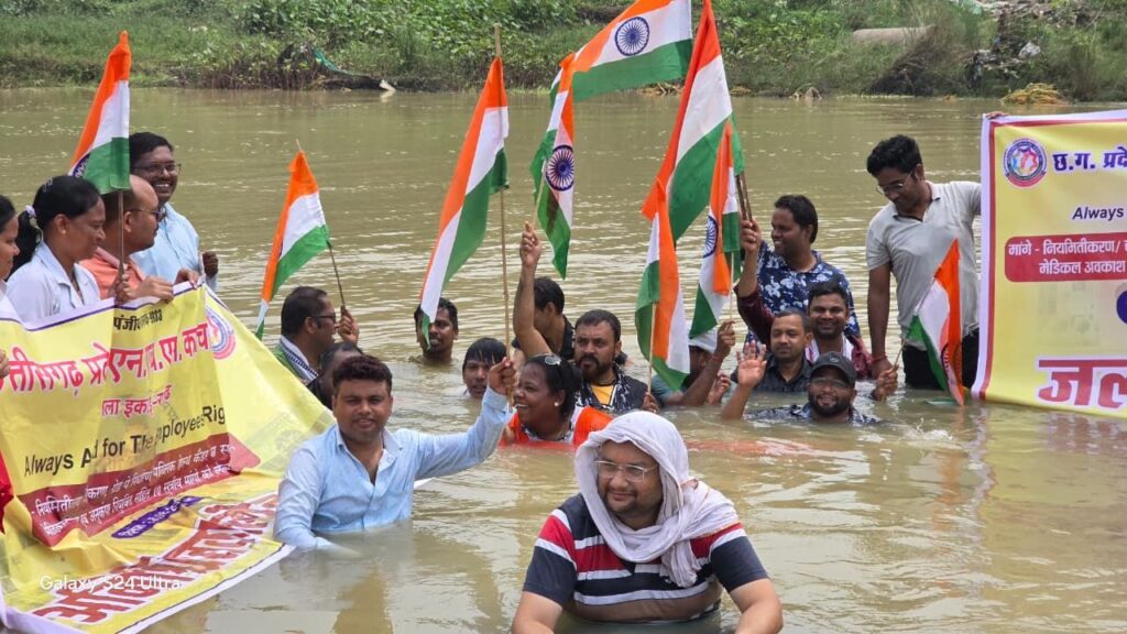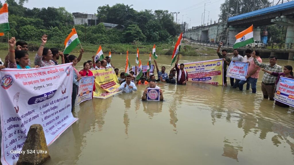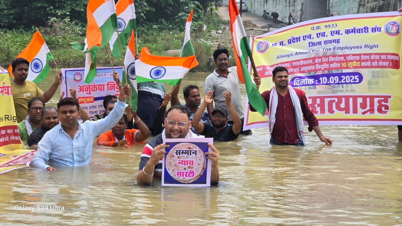 रायगढ़ दिनांक: 10 सितंबर 2025 छत्तीसगढ़ के राष्ट्रीय स्वास्थ्य मिशन (एनएचएम) कर्मचारी, जो 20 वर्षों से स्वास्थ्य सेवाओं की रीढ़ बने हुए हैं, आज भी अपनी 10 सूत्रीय मांगों को लेकर सड़कों पर हैं। 18 अगस्त 2025 से शुरू अनिश्चितकालीन हड़ताल का आज 24वां दिन है, लेकिन सरकार की ओर से केवल आश्वासनों की बौछार और बर्खास्तगी की तलवार लटक रही है। आज सैकड़ों कर्मचारियों ने तिरंगा झंडा और तख्तियों के साथ जल सत्याग्रह कर सरकार को “सद्बुद्धि” की प्रार्थना की, नारे गूंजे: “रघुपति राघव राजा राम, सरकार को सद्बुद्धि दे भगवान!” और “ईश्वर अल्लाह तेरो नाम, सरकार को सन्मति दे भगवान!”