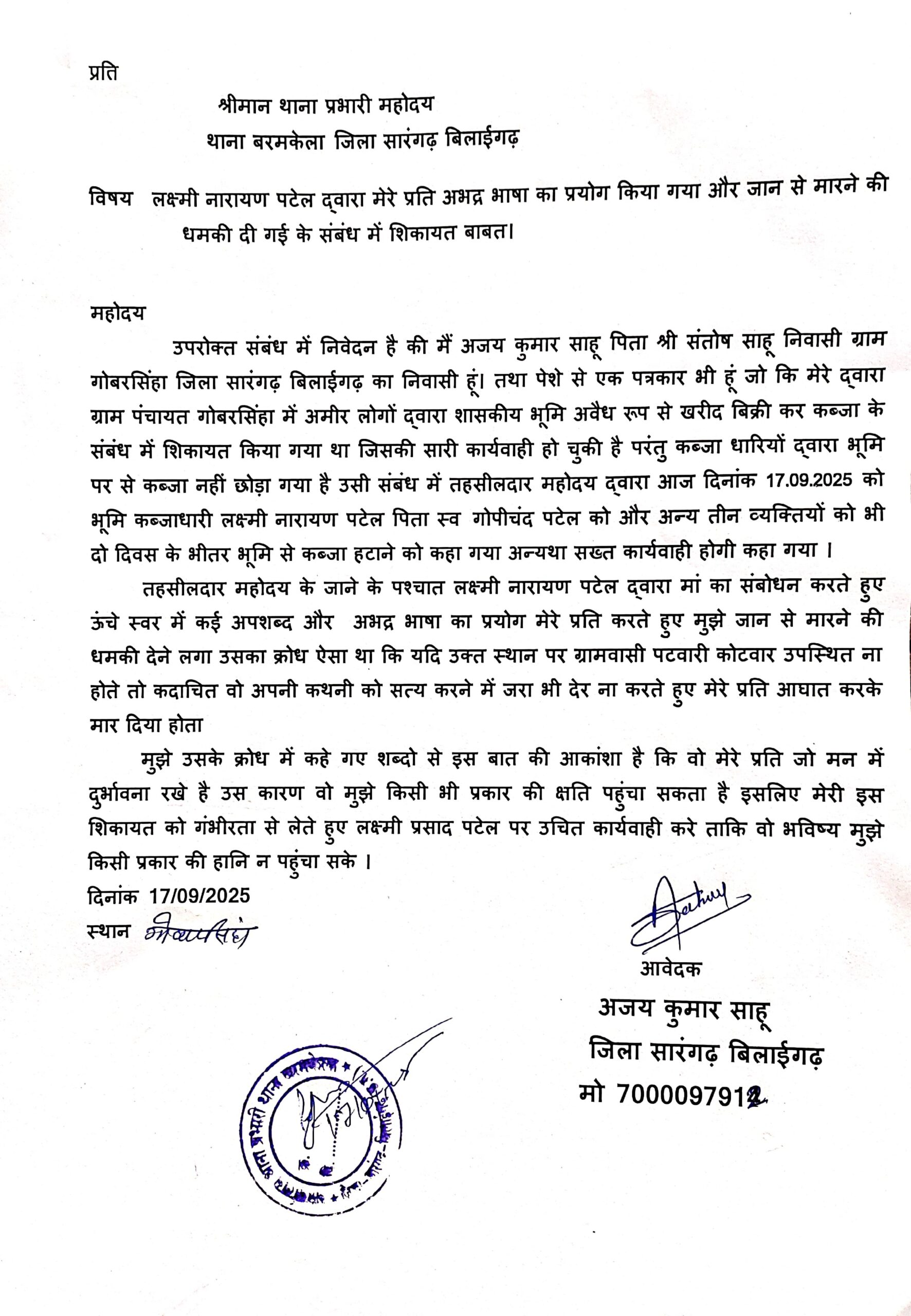 Jila sarangarh bilagarh /बरमकेला ब्लॉक के ग्राम पंचायत गोबरसिंहा में शासकीय भूमि पर अवैध कब्जे और निर्माण का मामला तूल पकड़ता जा रहा है। शिकायतकर्ता अजय साहू, जो कि स्वतंत्र पत्रकार भी हैं, ने इस मामले को लेकर तहसील कार्यालय में लिखित शिकायत दर्ज कराई थी। इस पर आज दिनांक 17 सितंबर 2025 को तहसीलदार ने मौके पर पहुंचकर जांच की और स्पष्ट निर्देश दिए कि 2-3 दिनों के भीतर शासकीय भूमि को खाली किया जाए। तहसीलदार के इस निर्देश से ग्रामीणों में उम्मीद जगी थी कि अब अवैध कब्जा हटेगा, लेकिन इसी बीच हालात बिगड़ गए।