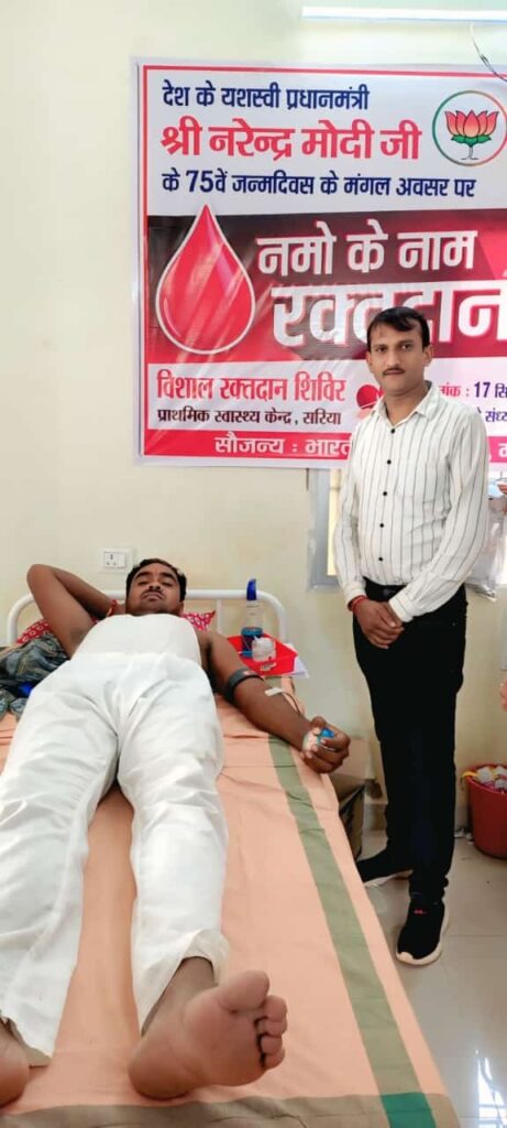 इसी तारतम्य में भारतीय जनता पार्टी मण्डल सरिया के द्वारा प्राथमिक स्वास्थ्य केन्द्र सरिया में रक्तदान शिविर का आयोजन किया। यह शिविर जन उपकार विकास सेवी संस्थान संजीवनी नर्सिंग होम रायगढ़ एवं प्राथमिक स्वास्थ्य केन्द्र सरिया में पदस्थ अधिकारी/कर्मचारी के सहयोग से संपन्न हुआ।
