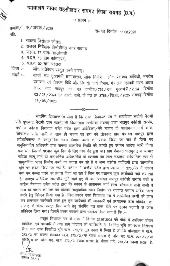 रायगढ़। सरकारी व्यवस्था और स्थानीय प्रशासन की लापरवाही एक बार फिर उजागर हुई है। ग्राम पंचायत भातपुर के आश्रित ग्राम साल्हेपाली अंतर्गत स्कूल के लिए आरक्षित शासकीय भूमि पर खुलेआम अतिक्रमण का मामला सामने आया है। तहसीलदार कार्यालय की टीम ने मौके पर पहुंचकर जांच की तो पाया कि स्कूल हेतु सुरक्षित 0.101हे. भूमि पर कन्हैया पटेल द्वारा खसरा नंबर 273/2क में बड़वाल डालकर कब्जा कर लिया गया है। यही नहीं, उक्त भूमि पर विद्युत ट्रांसफॉर्मर और पानी टंकी भी मौजूद पाई गई।