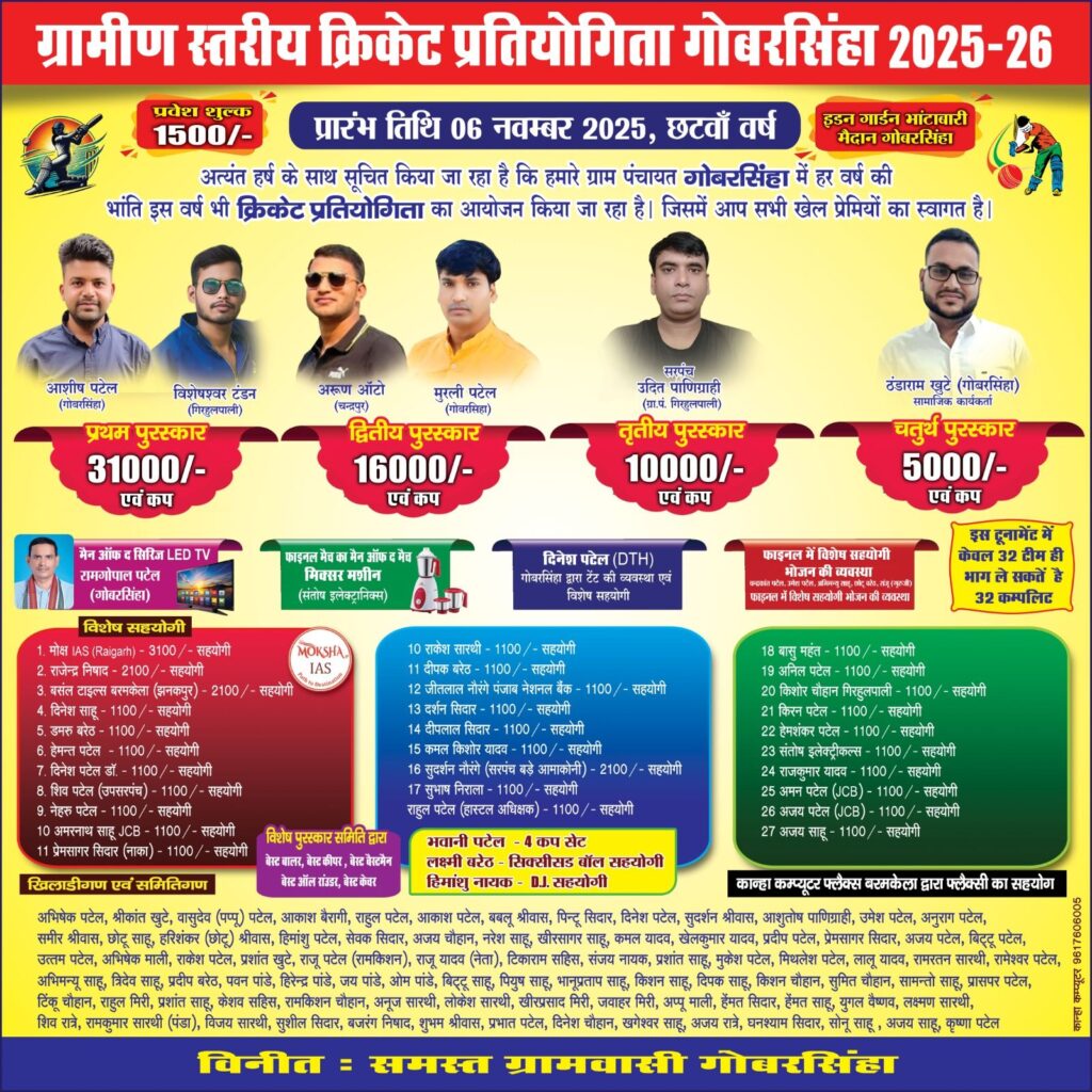 सारंगढ़-बिलाईगढ़ //आज गुरुवार को ग्राम गोबरसिंहा के भाटा बारी मैदान (जिसे ग्रामीणजन “ईडन गार्डन” के नाम से जानते हैं) में ग्रामीण स्तरीय क्रिकेट प्रतियोगिता का शानदार शुभारंभ हुआ। गांव के युवाओं में उत्साह और जोश देखने लायक था। पूरे मैदान में क्रिकेट प्रेमियों की भीड़ उमड़ पड़ी थी, वहीं उद्घाटन समारोह में उपस्थित अतिथियों ने इस आयोजन को खेल भावना और भाईचारे का प्रतीक बताया।