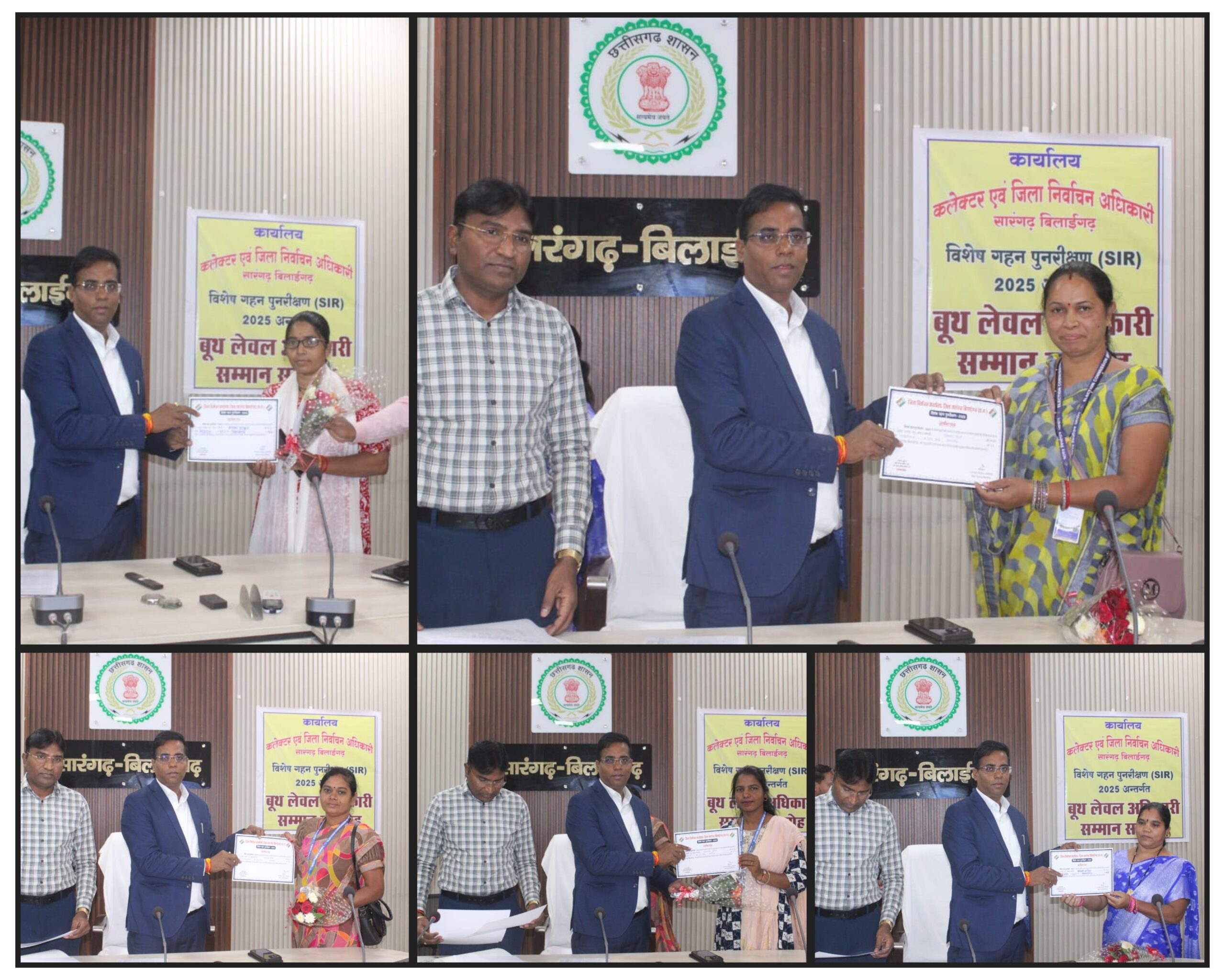 सारंगढ़ बिलाईगढ़, 22 नवंबर 2025/कलेक्टर डॉ. संजय कन्नौजे ने सारंगढ़ बिलाईगढ़ जिले के विधानसभा 17 सारंगढ़ में 100 प्रतिशत एसआईआर कार्य को पूर्ण करने वाली मथुरा पटेल को कलेक्टोरेट सभाकक्ष में सम्मानित किया। बीएलओ मथुरा ने ग्राम रेंगालमुड़ा मतदान क्रमांक 221 में 476 मतदाताओं का एसआईआर पूर्ण की हैं। इसके साथ साथ जिले के 4 अन्य बीएलओ को भी सम्मानित किया गया जिन्होंने अपने कार्य में अच्छा प्रगति लाई हैं। इनमें बीएलओ सहारतीन अनंत ने डंगनिया के 454 मतदातओं के 76 प्रतिशत और बीएलओ विमला पटेल ने पिकरीमाल में 504 मतदाताओं के 41 प्रतिशत कार्य पूर्ण की हैं। इसी प्रकार विधानसभा 43 बिलाईगढ़ क्षेत्र में बीएलओ मेनका ठाकुर ने तेन्दूदरहा के 980 मतदाताओं के 76 प्रतिशत और बीएलओ मंगली रत्नेश ने मंधाईभाठा के 1027 मतदाताओं के 67 प्रतिशत एसआईआर कार्य पूर्ण की है। इस अवसर पर अपर कलेक्टर एवं उप जिला निर्वाचन अधिकारी प्रकाश सर्वे, डिप्टी कलेक्टर शिक्षा शर्मा उपस्थित थीं।