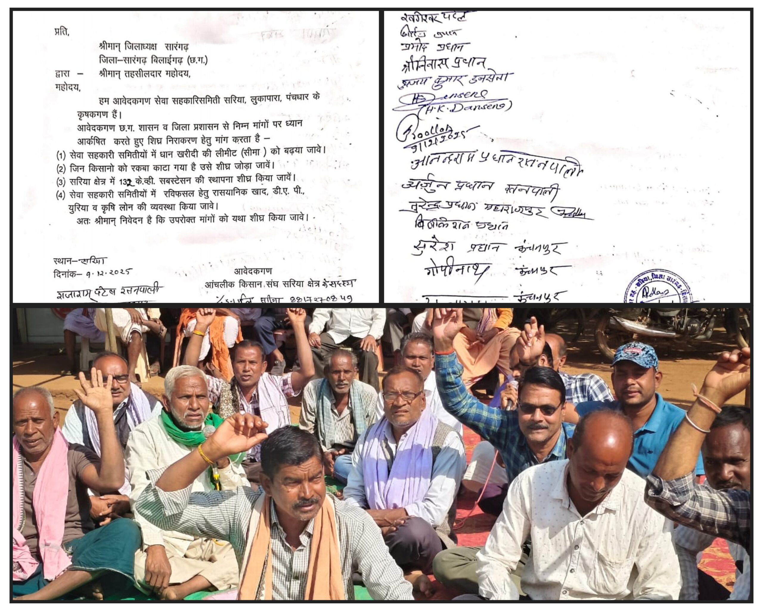 सारंगढ़-बिलाईगढ़।09/दिसंबर/2025=क्षेत्र का किसान आज त्राहि-त्राहि कर रहा है। धान खरीदी की लिमिट, कटे हुए रकबा,KCC रबी, खरीफ़,बिजली संकट और खेती के लिए जरूरी रासायनिक खाद की भारी किल्लत—इन तमाम समस्याओं को लेकर सरिया, लुकापारा और पचधारा क्षेत्र के किसानों का गुस्सा अब फूट पड़ा है। अंचलिक किसान संघ सरिया क्षेत्र के किसानों ने इन गंभीर समस्याओं को लेकर जिला प्रशासन को ज्ञापन सौंपते हुए स्पष्ट शब्दों में चेताया है कि अगर शीघ्र समाधान नहीं हुआ तो आने वाले दिनों में बड़ा आंदोलन किया जाएगा।