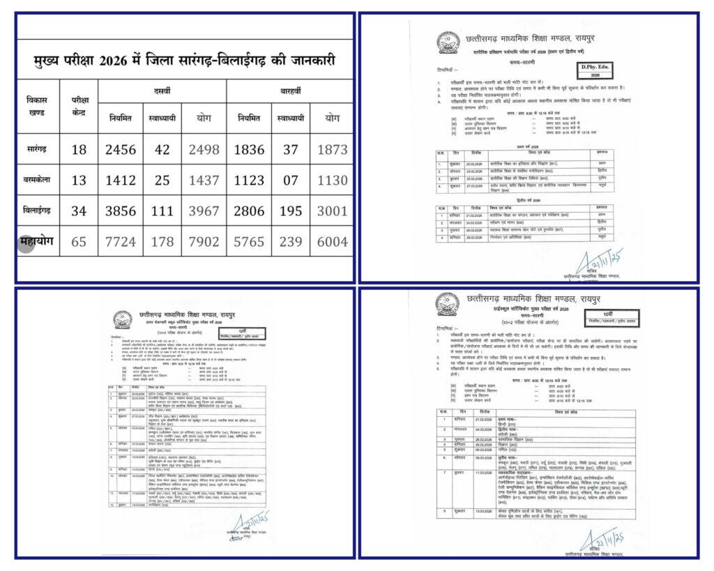 जिला सारंगढ़ बिलाईगढ़ :- आज से कक्षा 10वीं बारहवीं बोर्ड परीक्षा प्रारम्भ हुआ है, इसके बाद बारहवीं की परीक्षा भी प्रारम्भ होगा जो 13 मार्च तक आयोजित की जाएंगी। परीक्षाओं के सुचारु, निष्पक्ष एवं पारदर्शी संचालन के लिए उड़नदस्ता दल एवं ऑब्जर्वर की नियुक्ति की गई है ।
