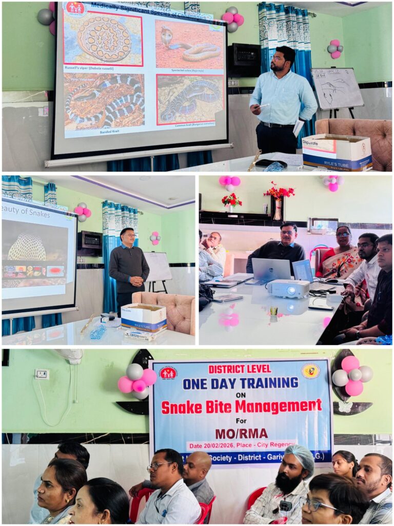 जिले में सर्पदंश (Snakebite Envenoming) के मामलों में त्वरित उपचार और मृत्यु दर में कमी लाने के उद्देश्य से एकीकृत रोग निगरानी कार्यक्रम (IDSP) गरियाबंद के तत्वावधान में होटल सिटी रीजेंसी में एक दिवसीय तकनीकी प्रशिक्षण कार्यशाला का आयोजन किया गया।