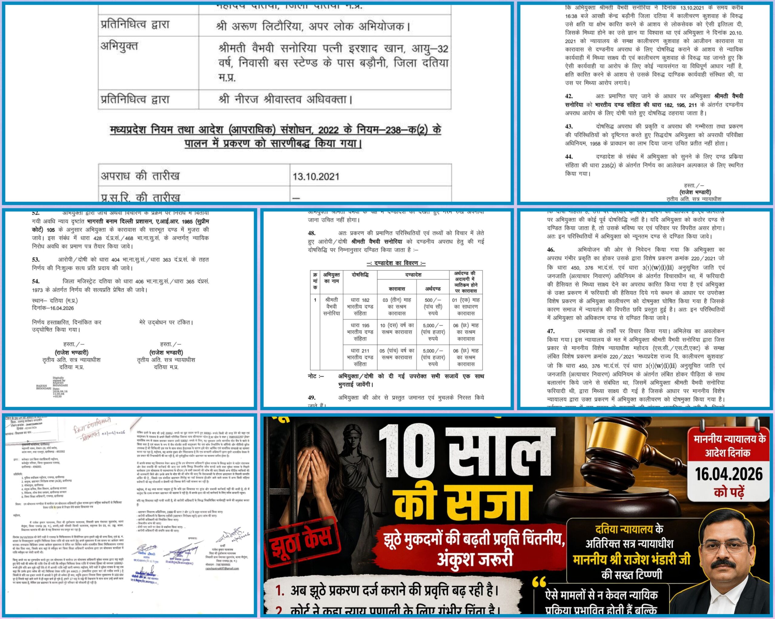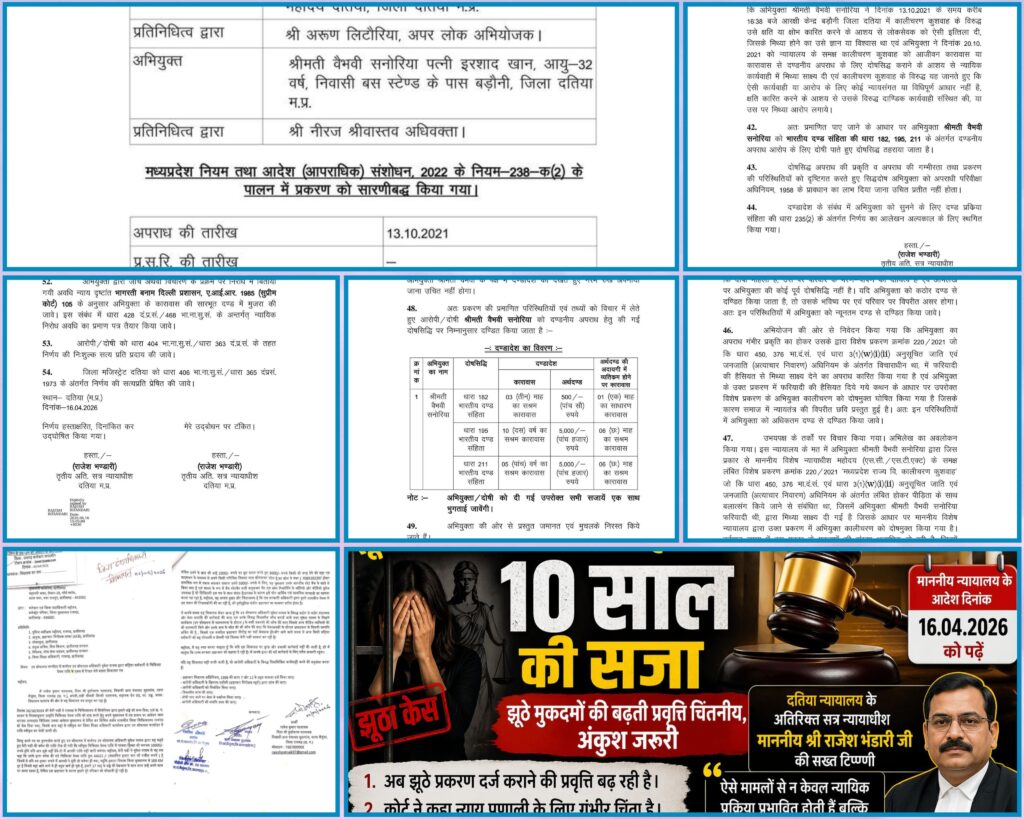 दतिया, 21 अप्रैल 2026। मध्यप्रदेश के दतिया जिले से न्याय व्यवस्था को लेकर एक महत्वपूर्ण और सख्त फैसला सामने आया है। दुष्कर्म और एससी-एसटी एक्ट के तहत झूठा मामला दर्ज कराने वाली एक महिला को न्यायालय ने 10 वर्ष के कठोर कारावास और 10,500 रुपये के अर्थदंड की सजा सुनाई है। यह फैसला अतिरिक्त सत्र न्यायाधीश माननीय श्री राजेश भंडारी द्वारा 16 अप्रैल 2026 को सुनाया गया।