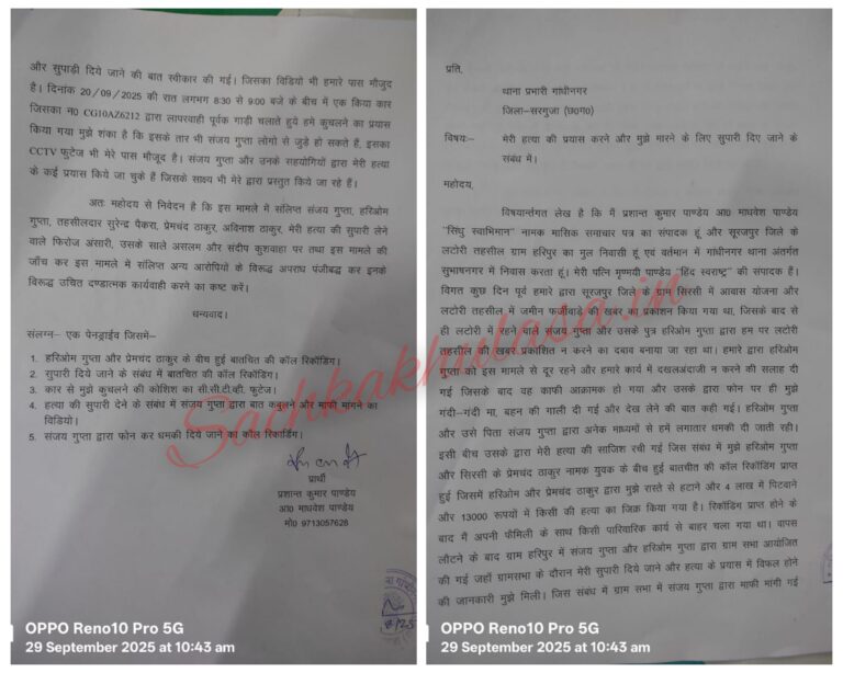 पत्रकार प्रशान्त पाण्डेय की हत्या की साजिश रचने वाले भ्रष्ट तंत्र का पर्दाफाश — आईजी सरगुजा रेंज से शिकायत, सुरक्षा...
