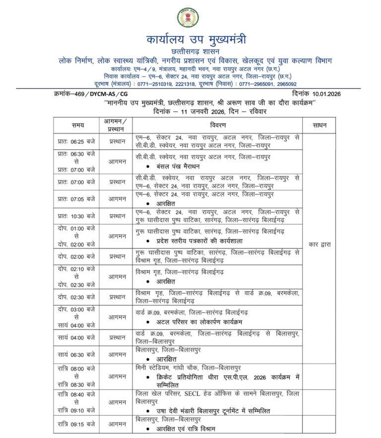 सारंगढ़ / कार्यालय उप मुख्यमंत्री, छत्तीसगढ़ शासन द्वारा उप मुख्यमंत्री के सारंगढ़–बरमकेला दौरे का विस्तृत प्रोटोकॉल आधिकारिक रूप से जारी...